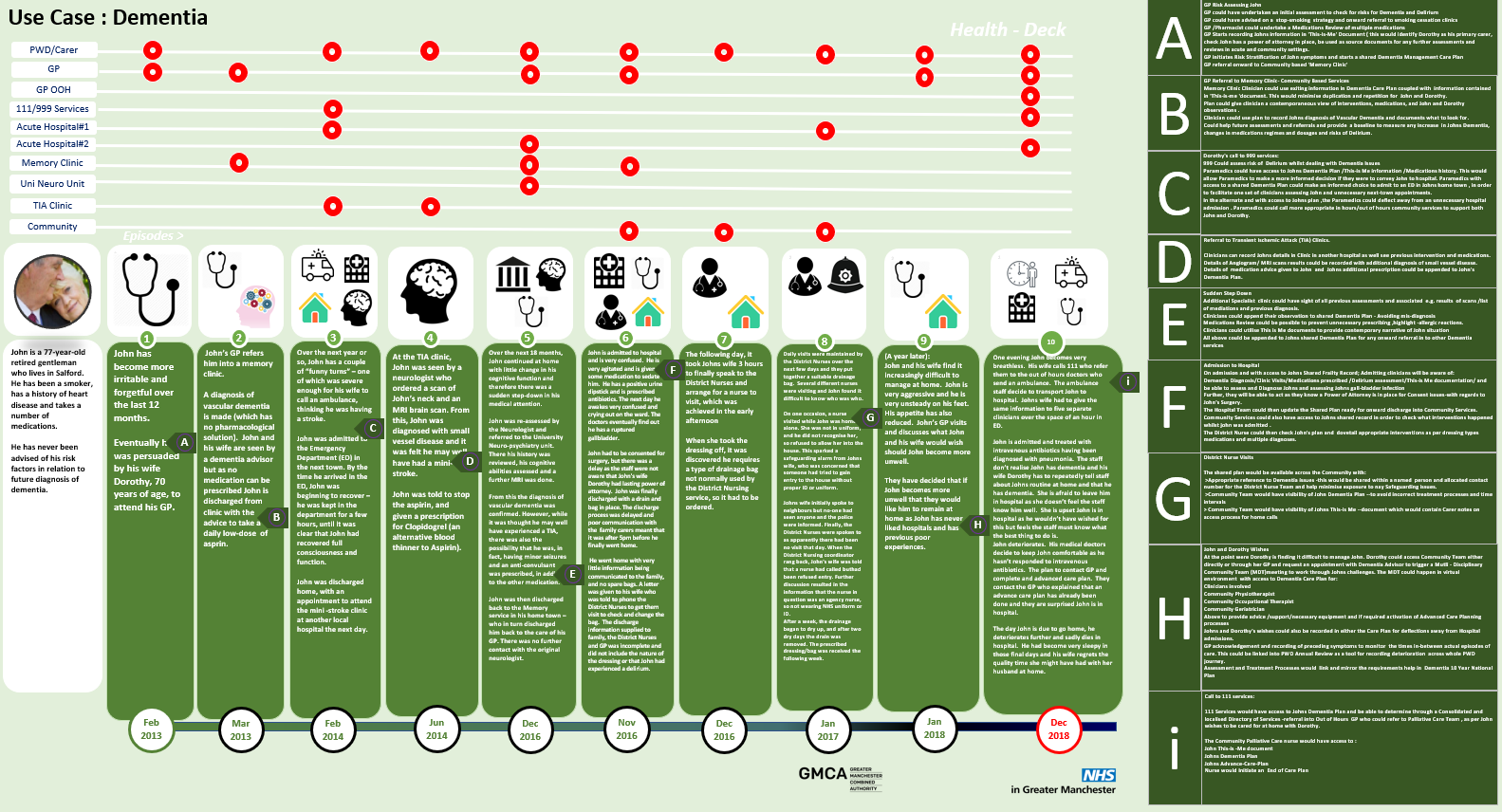 The result of our work with citizens and our clinical leads has been to produce a detailed typical dementia and frailty patient journey from diagnosis, through to end of life. Along this journey we’ve identified the current gaps in care that improved information sharing could help to address, and this is what the technology will support us with.