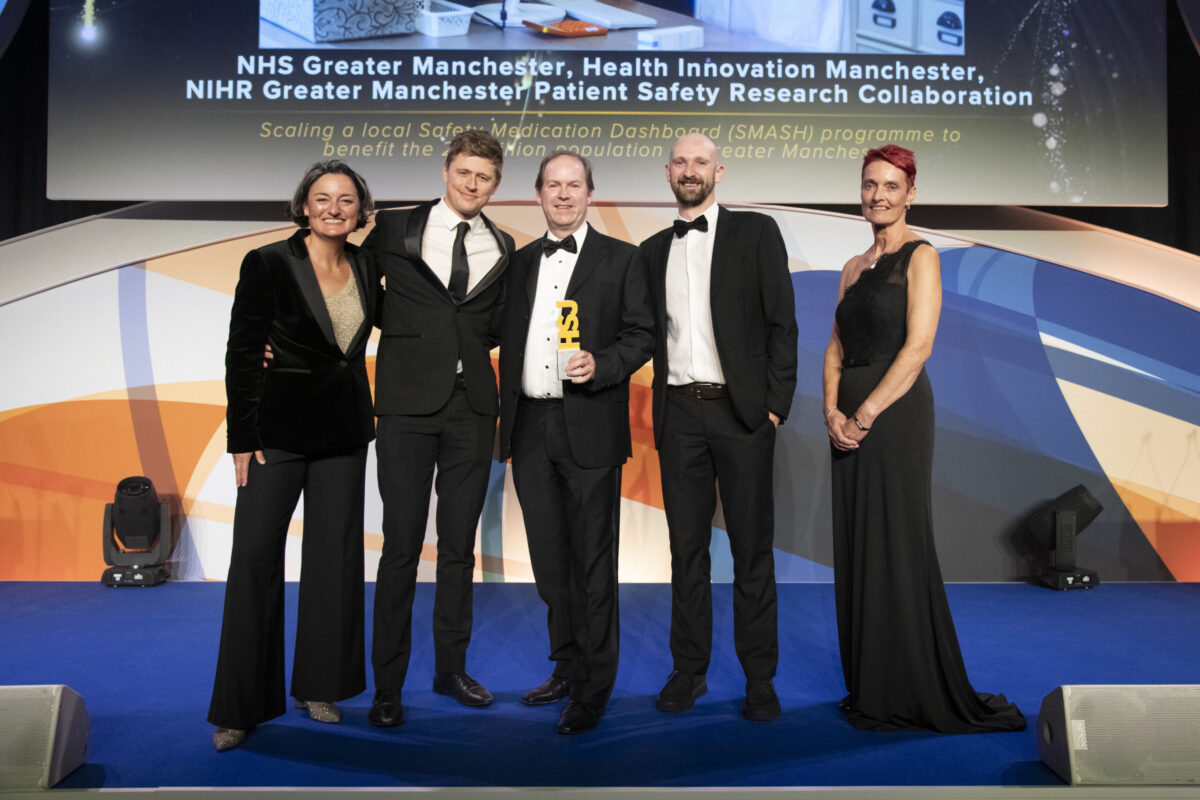 We’re delighted to announce that NHS Greater Manchester, Health Innovation Manchester, and NIHR Greater Manchester Patient Safety Research Collaboration has won the Improving Medicines Safety Award for ‘Scaling a Local Safety Medication Dashboard (SMASH) Programme to Benefit the 2.8 Million Population of Greater Manchester’ at this year’s HSJ Patient Safety Awards – an esteemed awards programme, designed to encourage and drive improvements in culture and quality across the NHS.
