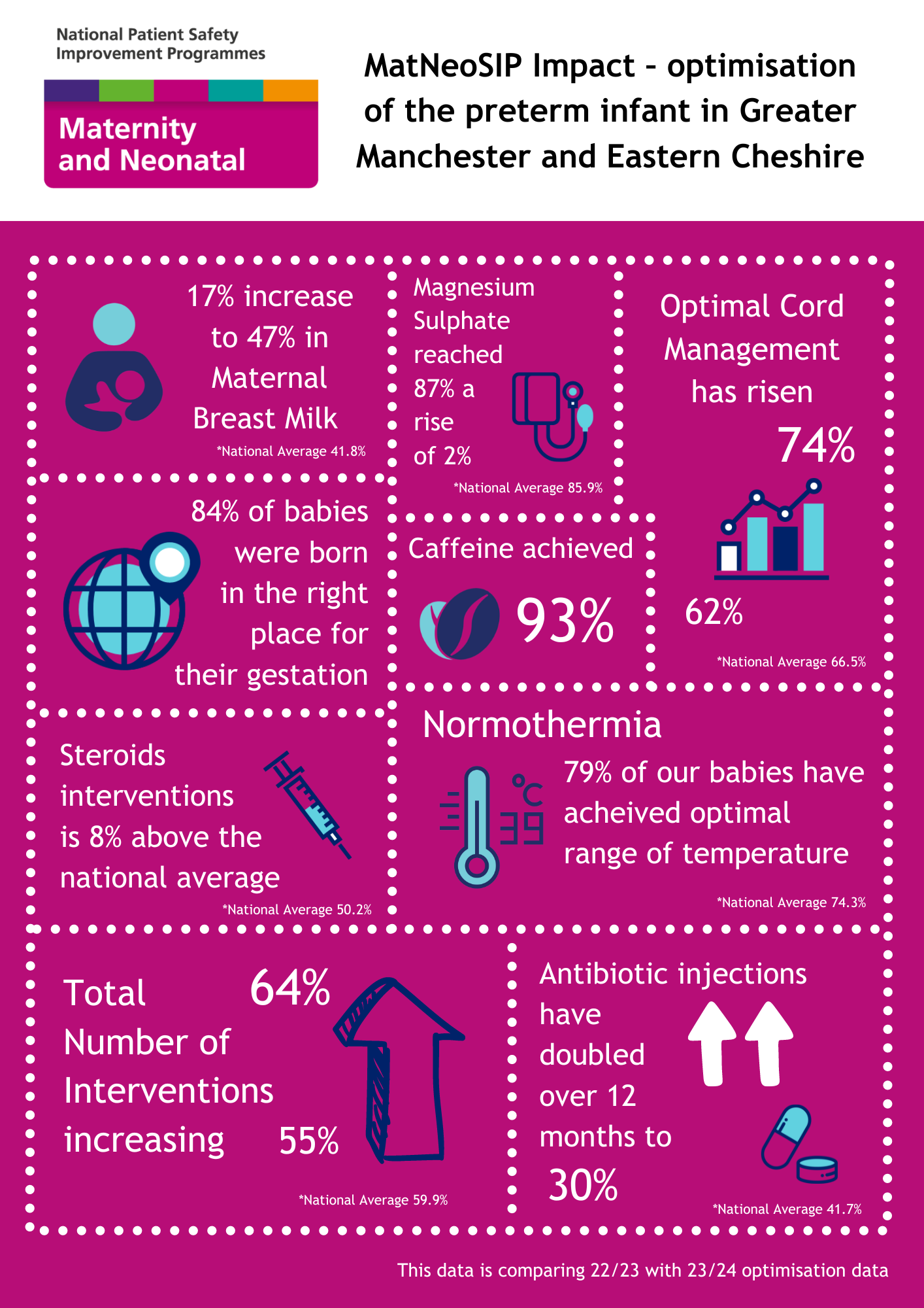We will continue to work directly with optimisation teams to deliver and embed the nine key evidenced based preterm perinatal optimisation interventions that are proven to improve outcomes.