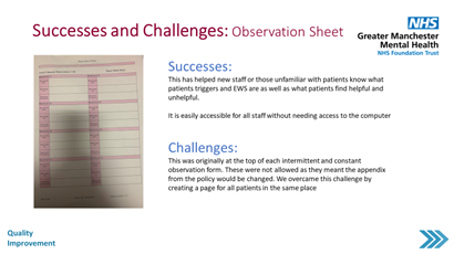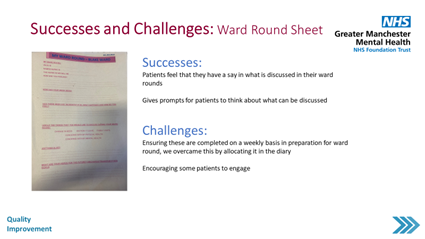 Next up we welcomed Erin Grinyer, a charge nurse and QI champion at GMMH. Erin presented a retrospective of the changes and results that they have worked on while participating in the programme. Among the plethora of ideas and learning that Erin shared, an example of a successful change was the introduction of an observation sheet that helps staff become more familiar, more quickly with individuals on the ward and avoid triggers that tend to lead to restrictive practices. Similarly, ward round sheets have been introduced to ensure continuity between shifts and therefore minimise patients’ frustrations. In addition to changes in patient care, the ward has been introducing ideas aimed at improving staff-wellbeing. These have already led to staff feeling more appreciated and valued and this in turn changes seen changes in the way staff engage with patients.